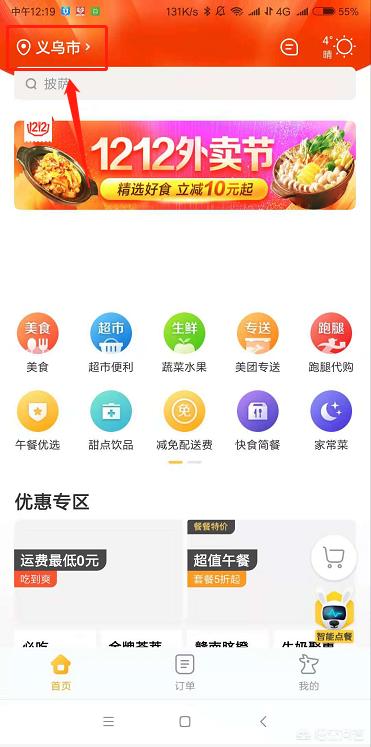 2.进入美团外卖APP主页面后,点击左上角的位置选项。
