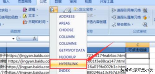 2、然后,我们需要再点击查找与引用下拉的三角形,从弹出的对话框中选中HYPERLINK函数。