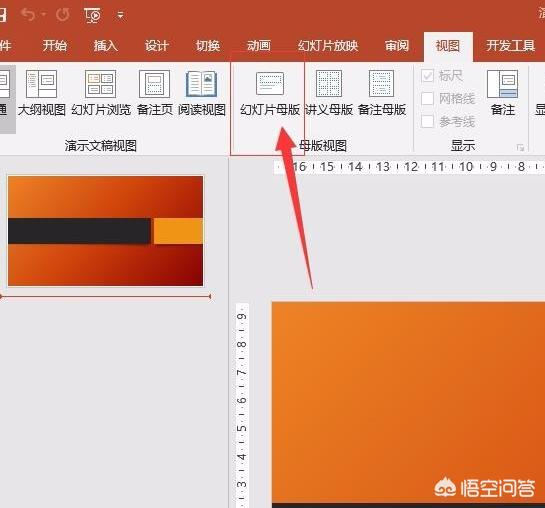 2、在弹出的选项卡里面点击“幻灯片母版”。