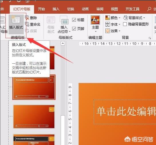 3、在弹出母版菜单选项在弹出的选项里面,点击“插入版式”命令。