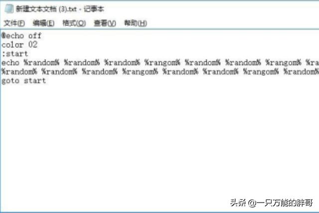 3、在打开的文档输入以下代码:@echo off color 02 :start echo %random% %random% %random% %rangom% %random% %random% %rangom% %random% %random% %random% %random% %random% %rangom% %random% %random% %rangom% %random% %random%goto start