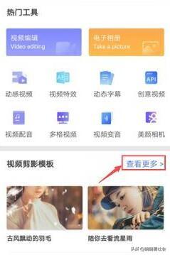 1.手机中下载“清爽视频编辑器”,安装后打开,在首页中找到视频剪影模板,打开【查看更多】选项。