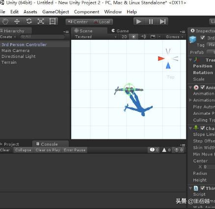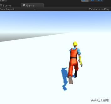 2.在Unity编辑器上打开游戏场景或创建一个新的游戏场景,在这里为了简单演示如何运行游戏,所以只创建一个地形与一个人物,如下图所示。