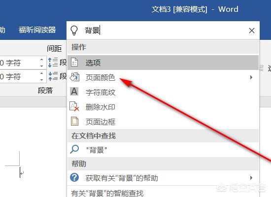 word文档怎么插入底图后编辑文字?1、在word界面最上方点击搜索栏,在搜索栏中搜索“背景”,并点击搜索结果:“页面颜色”。